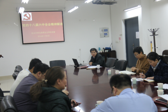 11月2日下午,马克思主义主义学院党委理论中心组在文管学馆A217会议室组织党的十八届六中全会精神解读研讨会,学院领导班子成员、党委委员、各支部书记、院工会和院团委负责人参加此次研讨会,研讨会由院党委书记张满胜主持。