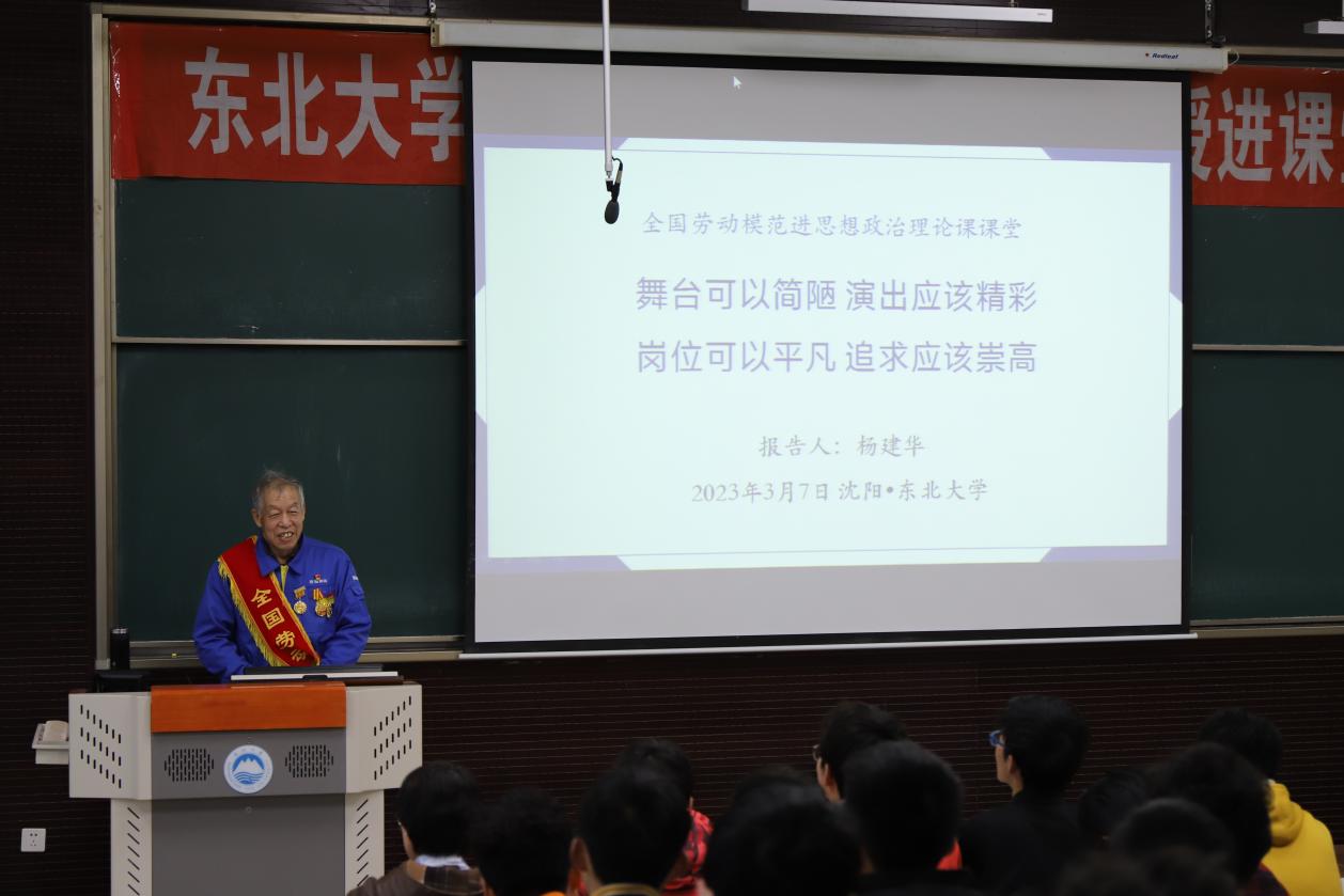 为深入学习宣传贯彻党的二十大精神,大力弘扬劳模精神、劳动精神、工匠精神,引导广大青年学生从中汲取信仰力量,3月7日,全国劳动模范、沈阳鼓风机集团教授级首席工人专家、东北大学思想政治理论课特聘教授杨建华应邀走进东北大学“中国近现代史纲要”课堂,以“舞台可以简陋 演出应该精彩 岗位可以平凡 追求应该崇高”为题,为东北大学学生讲授了一场生动的思政课。