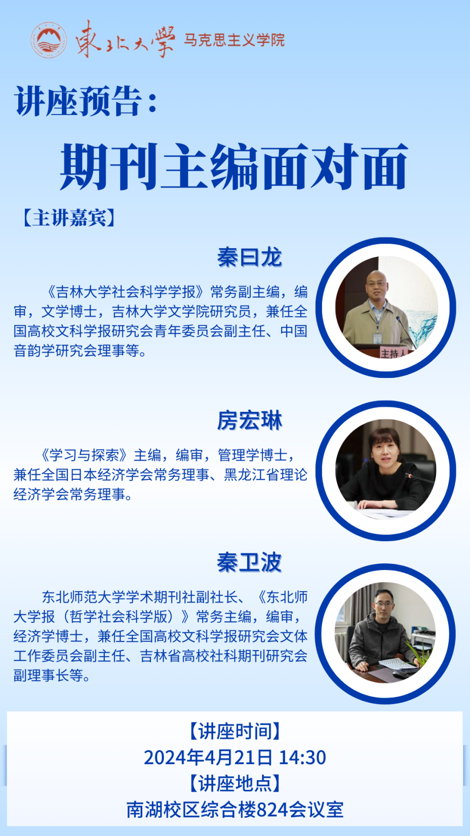 秦卫波:东北师范大学学术期刊社副社长、《东北师大学报(哲学社会科学版)》常务主编,编审,经济学博士,兼任全国高校文科学报研究会文体工作委员会副主任、吉林省高校社科期刊研究会副理事长等。《东北师大学报(哲学社会科学版)》是综合性人文社会科学学术期刊,现为国家社科基金资助期刊、CSSCI来源期刊、全国中文核心期刊、中国人文社会科学AMI核心期刊。