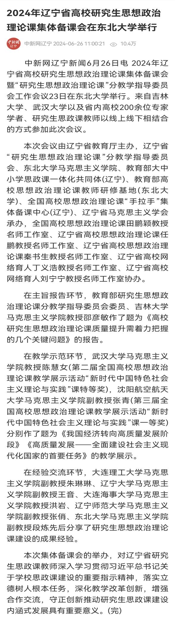 中新网辽宁新闻6月26日电 2024年辽宁省高校研究生思想政治理论课集体备课会暨“研究生思想政治理论课”分教学指导委员会工作会议23日在东北大学举行。来自吉林大学、武汉大学以及省内高校200余位专家学者、研究生思政课教师以线上线下相结合的方式参加此次会议。