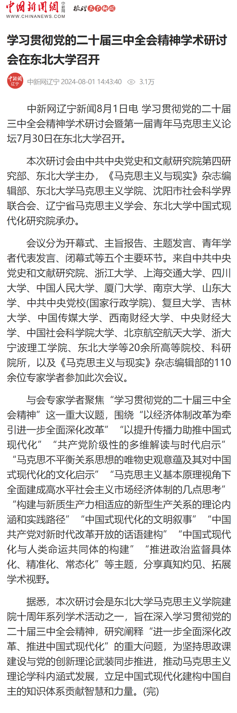 中新网辽宁新闻8月1日电 学习贯彻党的二十届三中全会精神学术研讨会暨第一届青年马克思主义论坛7月30日在东北大学召开。